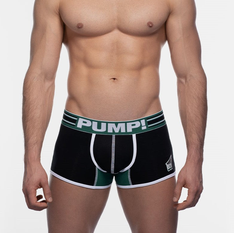 Boost boxers from PUMP! bring you that extra bit you need in the last stretch of your game. Its dark green stretch cotton crotch keeps things cool while you’re heating things up. It has a stretchy leg elastic to fit any leg size. A double-layered black mesh cup with green cotton liner and sporty piping is soft and supports you at the same time. Custom thermal pressed BOY insignia give it the pro-league look it deserves.