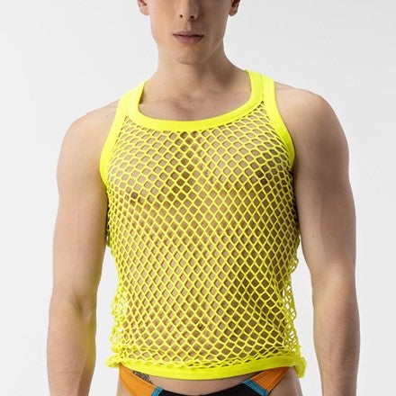 This fitted tank top features a bold, fishnet design that delivers a daring and edgy look. Solid trim around the neck and armholes adds structure, balancing the revealing style with a touch of definition. Designed for those who love to make a statement, this piece blends modern fashion with unapologetic confidence.