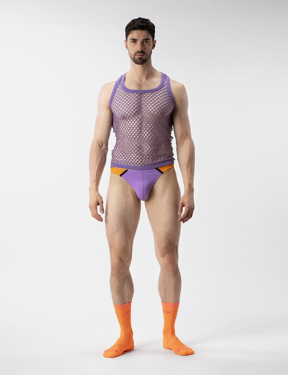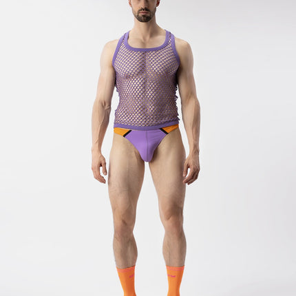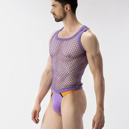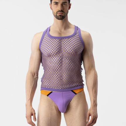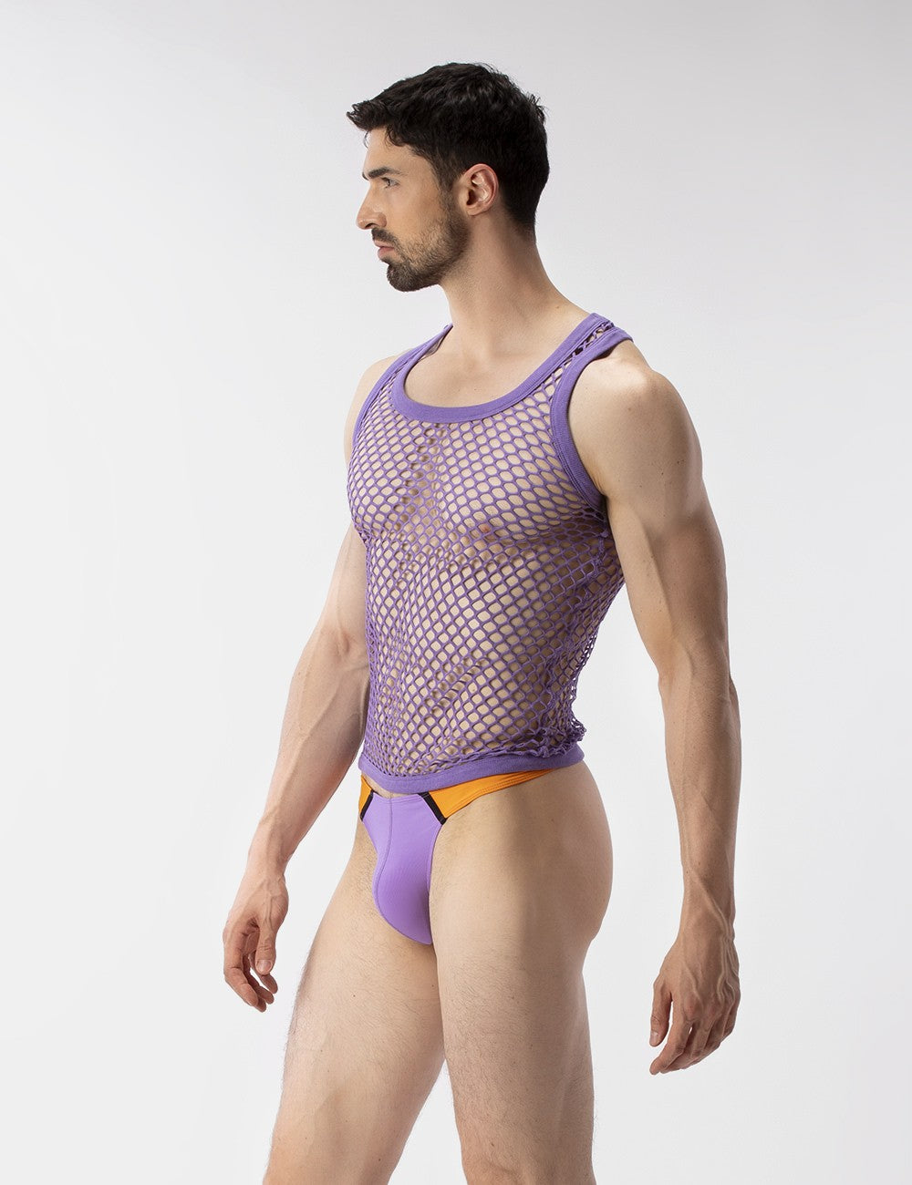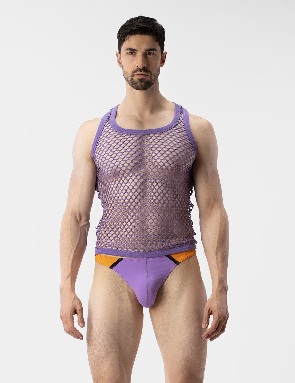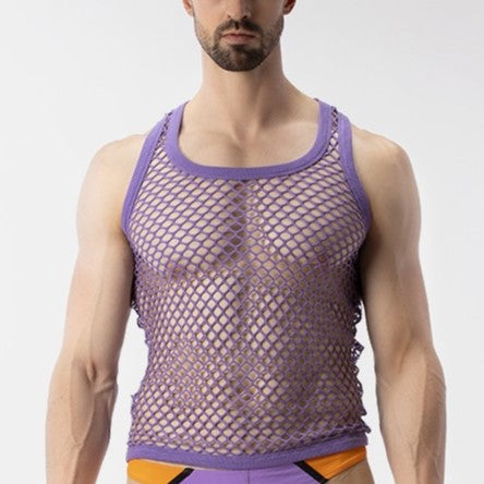 This fitted tank top features a bold, fishnet design that delivers a daring and edgy look. Solid trim around the neck and armholes adds structure, balancing the revealing style with a touch of definition. Designed for those who love to make a statement, this piece blends modern fashion with unapologetic confidence.