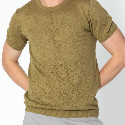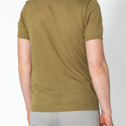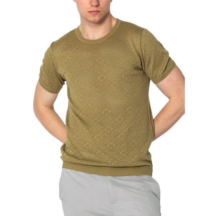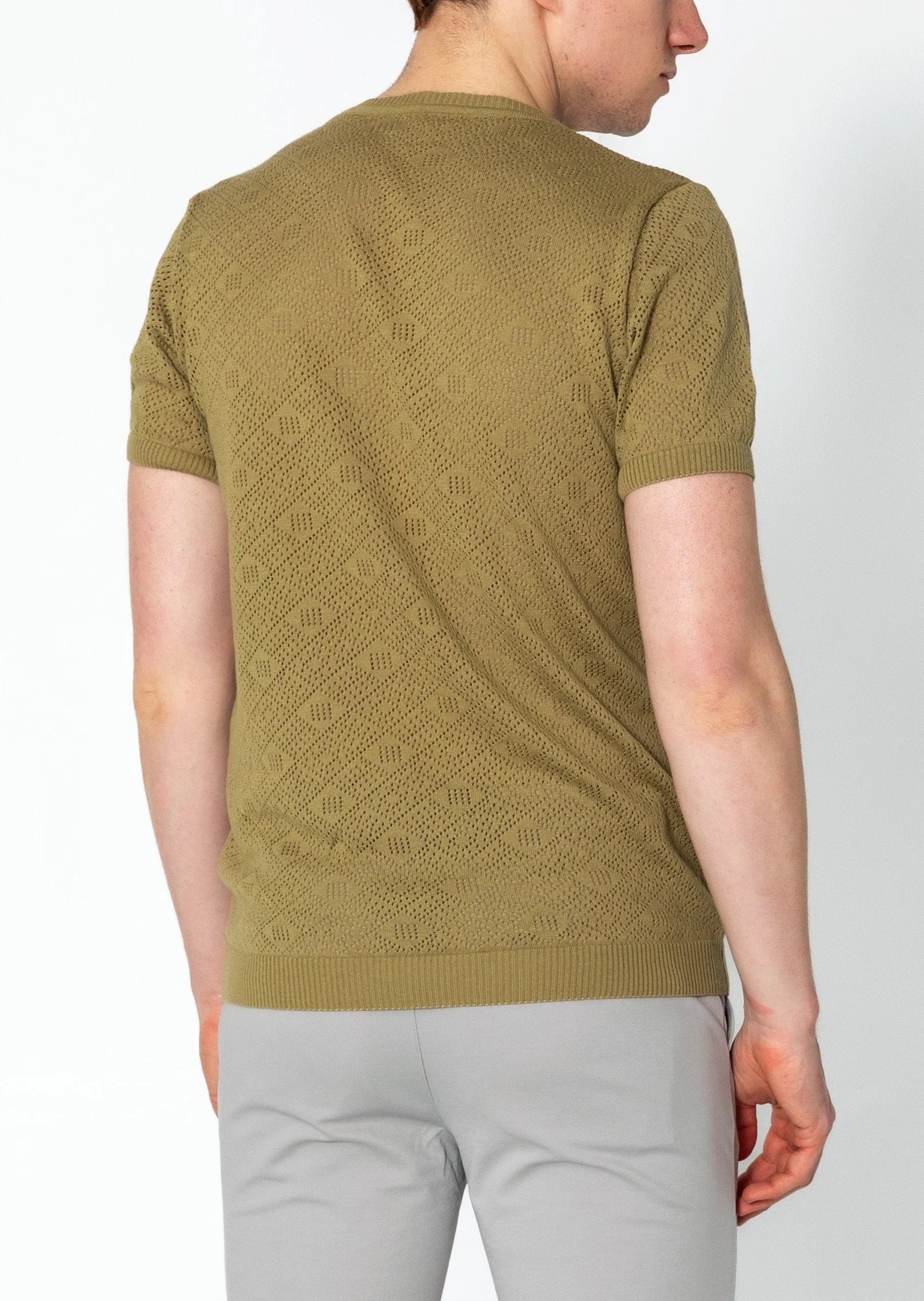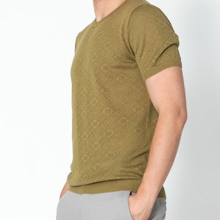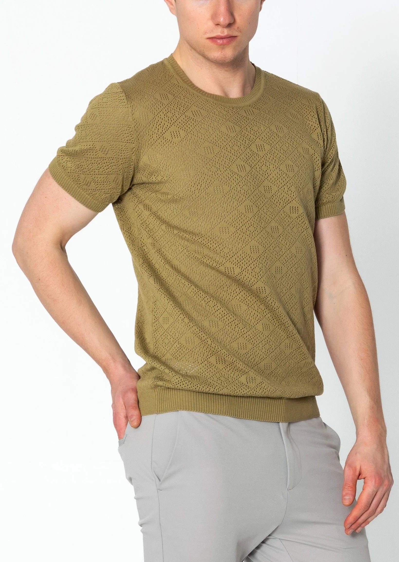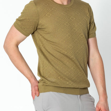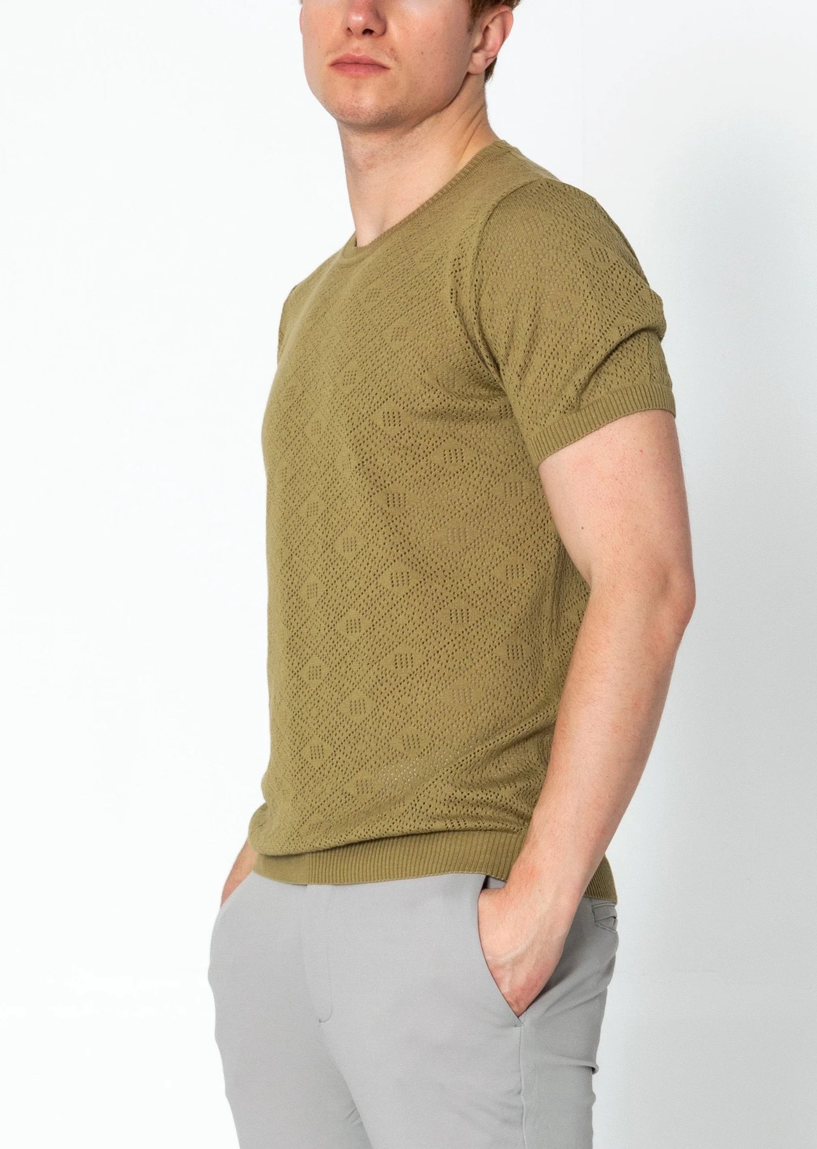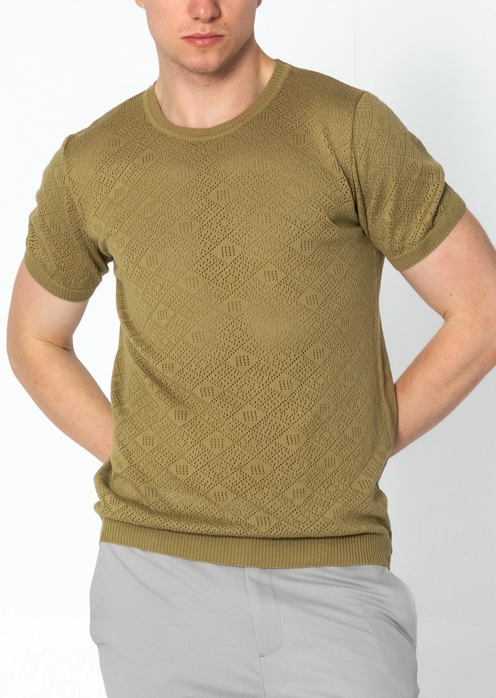 Crafted from high-quality crochet knit fabric, this t-shirt features a unique geometric pattern that adds a touch of modern flair. The crochet knit construction provides breathability and texture, making it ideal for warmer weather. With its tailored fit and attention to detail, this t-shirt is perfect for both casual and semi-formal occasions. Pair it with chinos or shorts for a relaxed daytime look, or dress it up with trousers for a more refined ensemble.