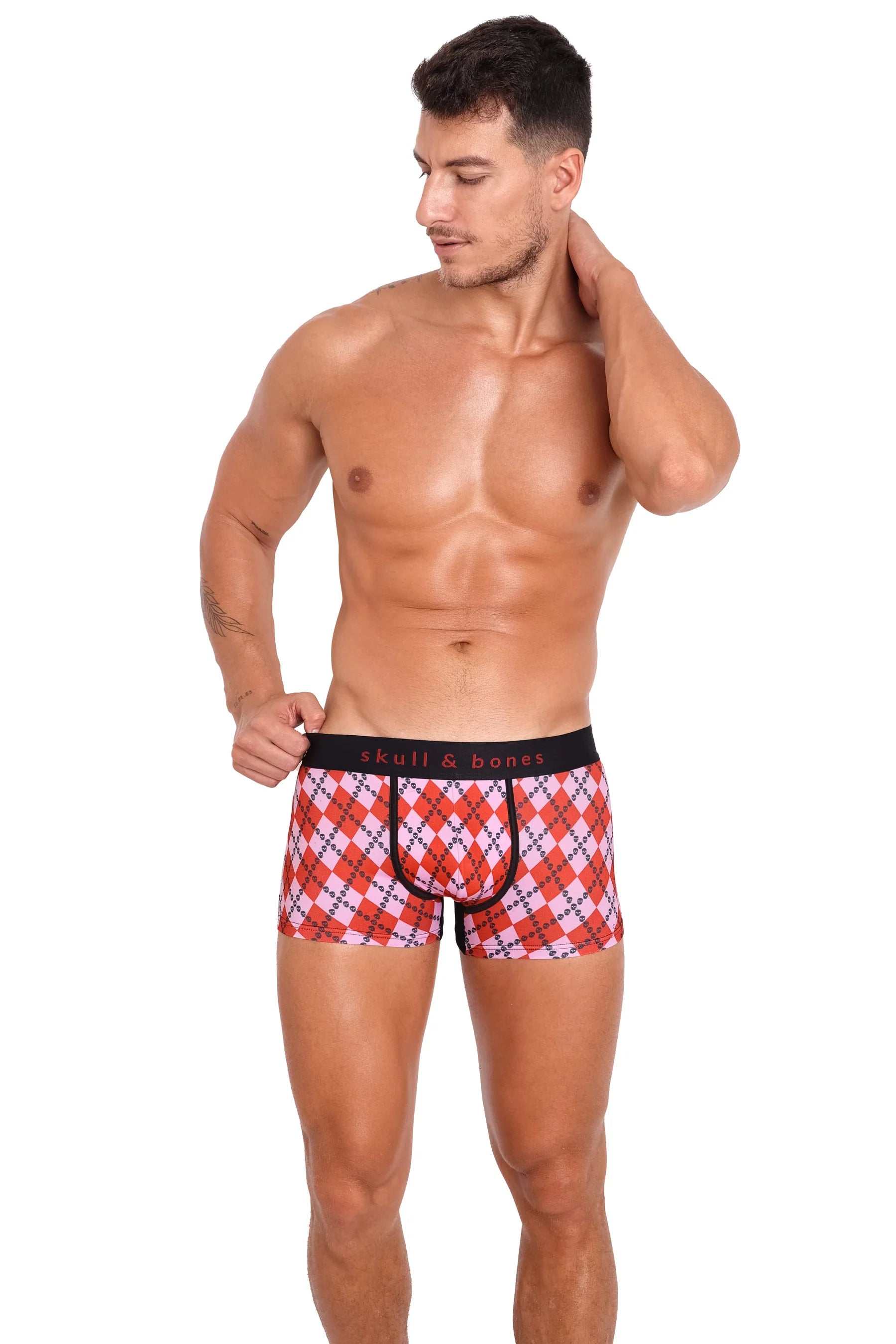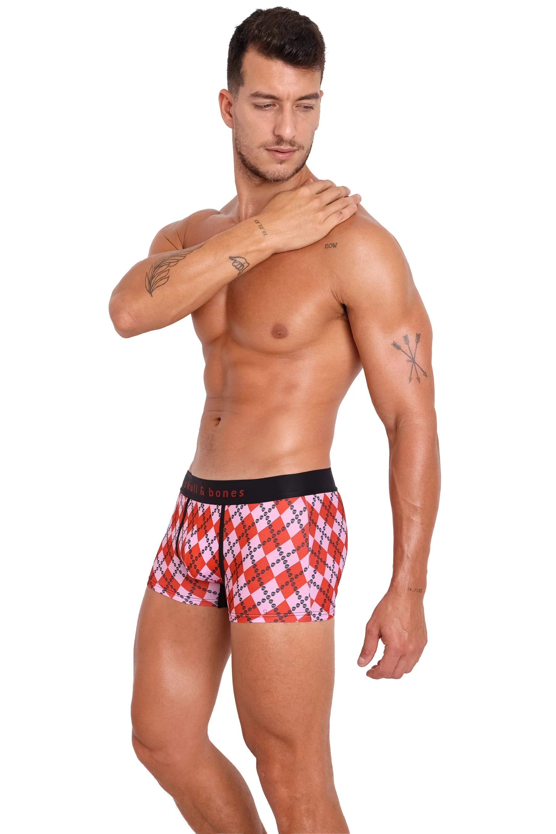 This design features a stylish checkered pattern in red and pink, with an unexpected twist of small skulls overlapping the grid. The unique combination of traditional argyle with a bold skull motif creates a look that's both sophisticated and rebellious.