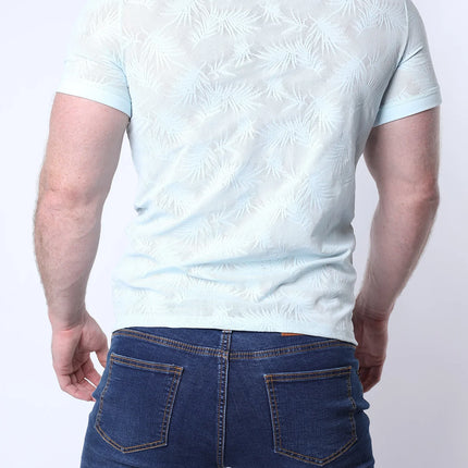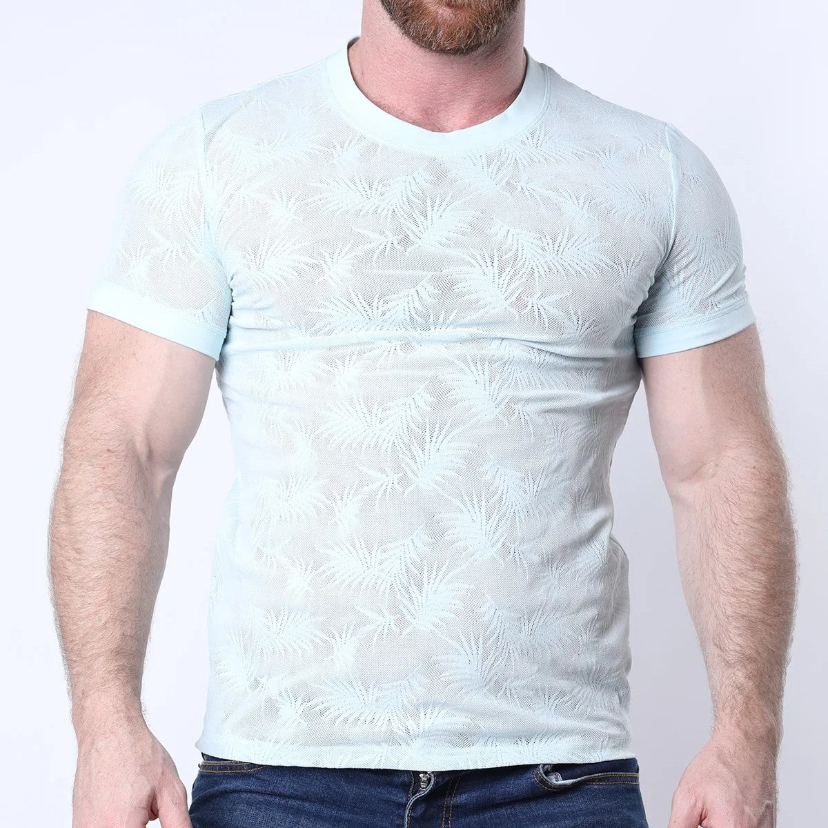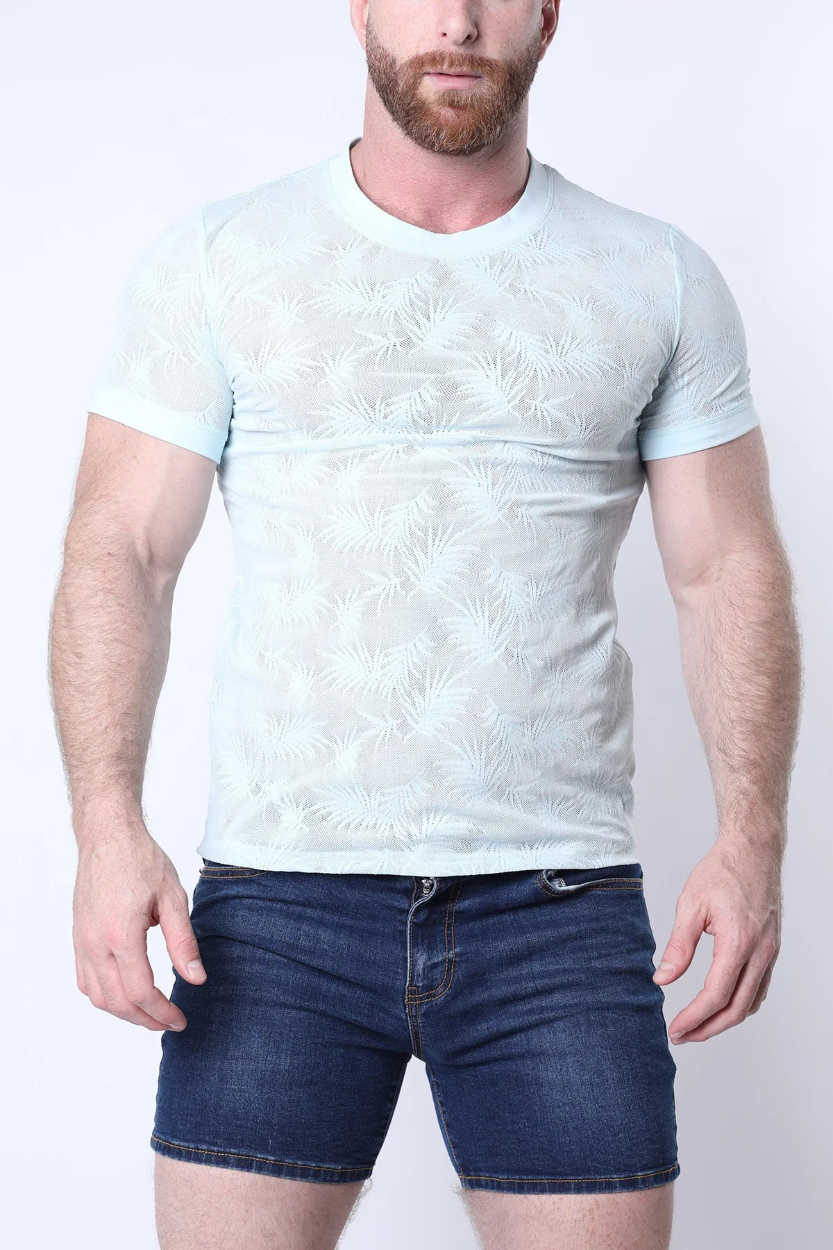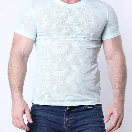 Turn up the heat in the Amalfi Mesh Tee from Timoteo, where bold meets breezy. Crafted from lightweight, semi-sheer mesh with an all-over tonal palm leaf pattern, this fitted tee subtly shows off your physique while keeping things tastefully provocative. The soft stretch fabric hugs just right, making it perfect for day parties, late nights, and everything in between. Finished with a classic crew neck and short sleeves for a versatile, elevated look. Match it with the Amalfi shorts to finish the look.