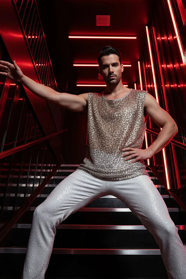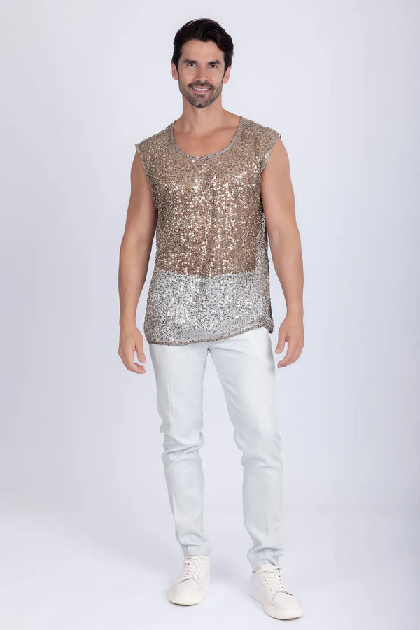 Elevate your collection with the Rimini men's sleeveless shirt, featuring an elegant hand-applied sequin pattern and semi-transparent fabric that highlights your physique. Its lightweight construction delivers a refined shimmer, while the relaxed fit ensures effortless comfort - perfect for a special night out. Finished with a distinctive crew-neck collar, the sheer, light-catching design is made to glow after dark and show just enough skin.