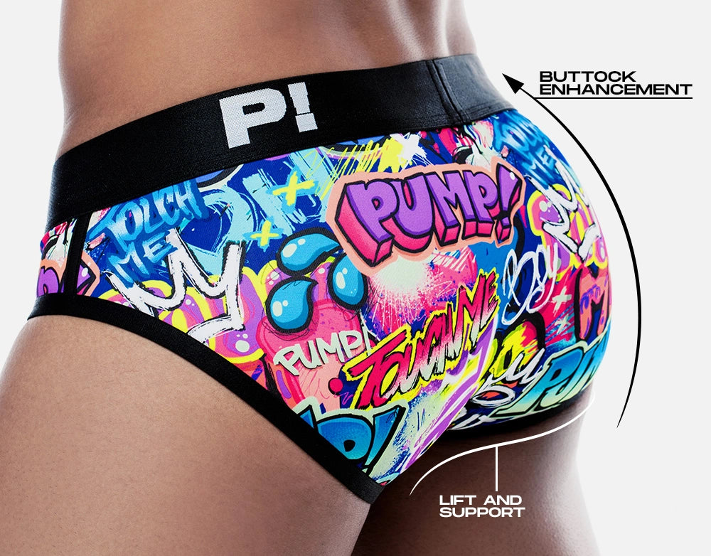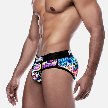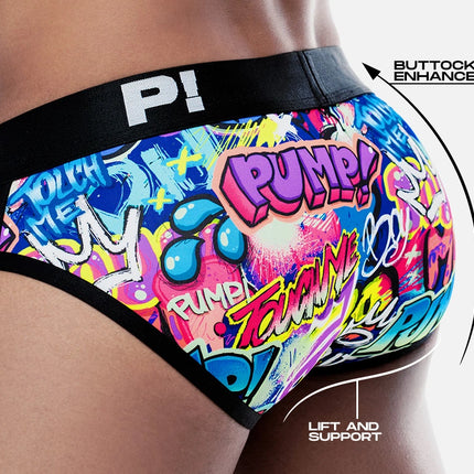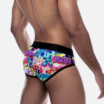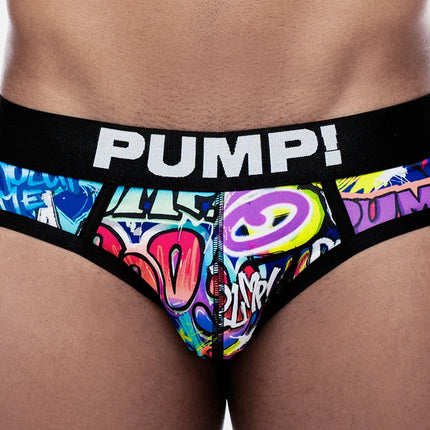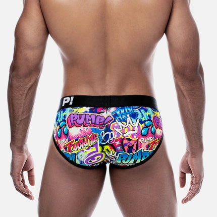 These new sexy briefs from PUMP will highlight your best assets - front and back! The placement of the graffiti print is different on each piece of underwear, offering you a unique pair each time. Its moisture-wicking, durable microfiber body will keep you cool while the black elastic waistband, accented with the classic PUMP! logo creates a snug and comfortable fit.