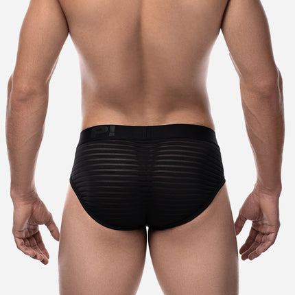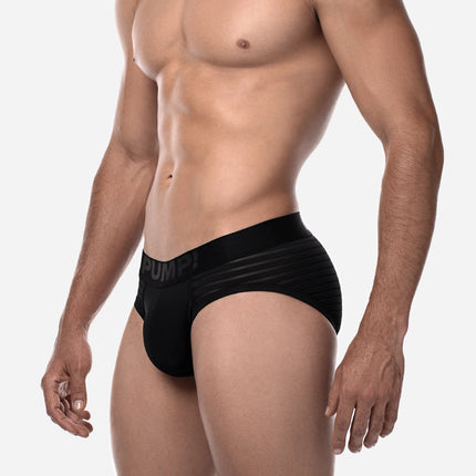 These new sexy briefs from PUMP! are designed to highlight your best assets - front and back. Featuring alternating sheer and solid stripes, they keep you cool while adding a seductive touch. A matching elastic waistband and roomy pouch complete the look, blending comfort with bold confidence.